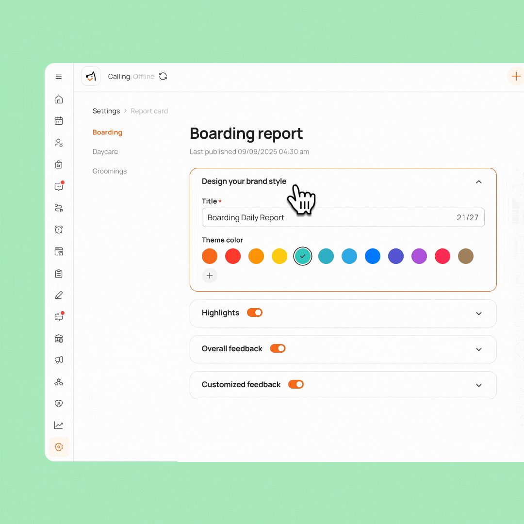 Create branded templates for Grooming, Daycare, and Boarding report cards โ and send them in bulk with a single click for consistent, professional results.