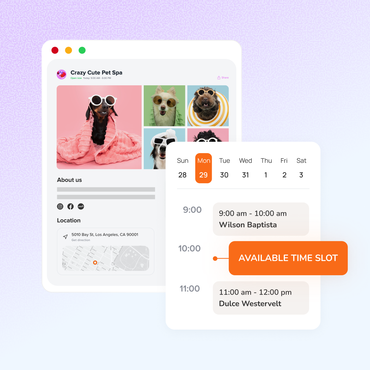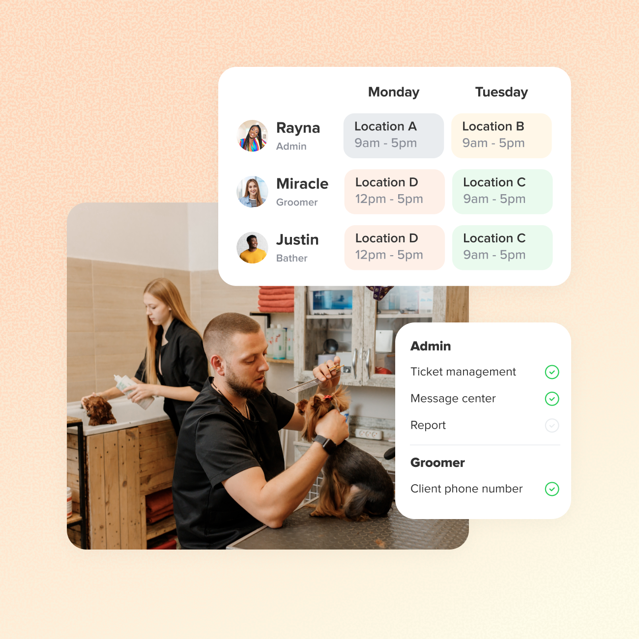 MoeGo’s advanced booking system gives you control. You can set time slots, limit the number of pets per slot/day, and apply booking rules by breed, size, or service. You can even set up rotating schedule and date override. Our amazing calendar shows real-time availability, tailored indicators and warnings about conflicts. These tools help you balance your team’s workload, and operations running smoothly — even on your busiest days.